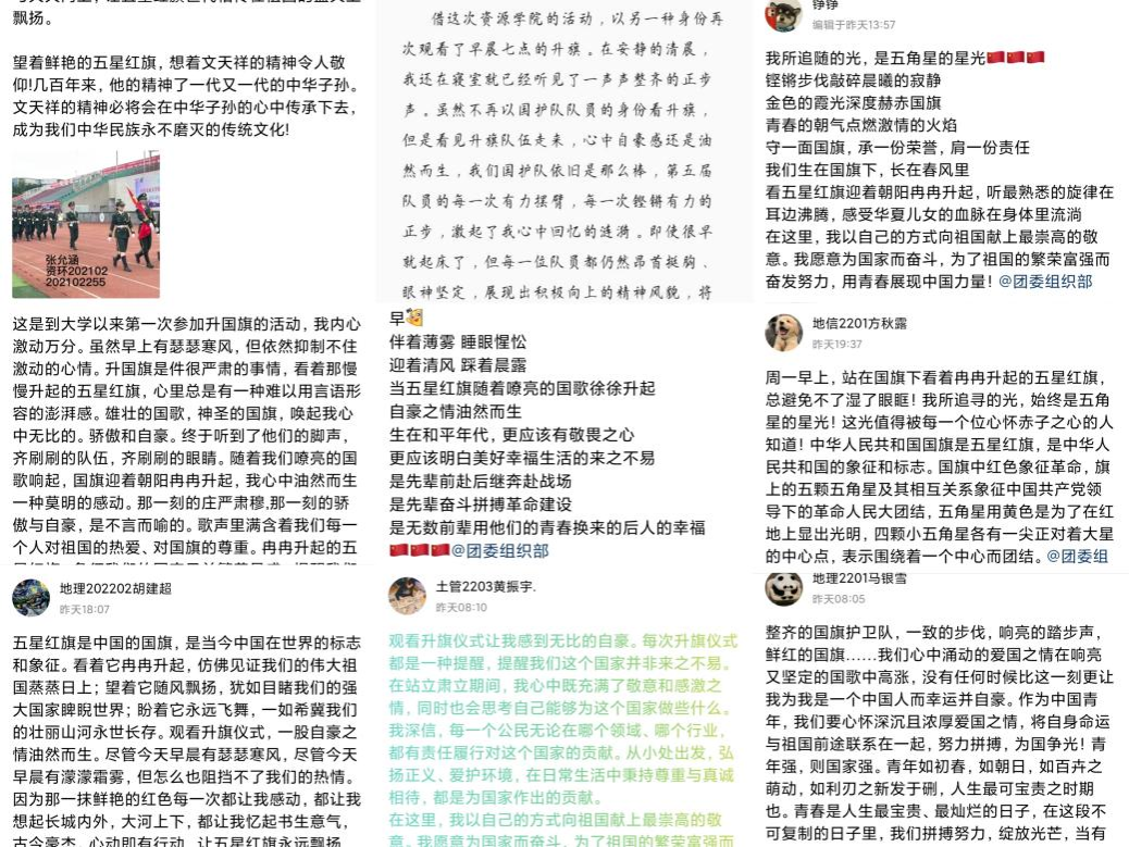 导航痕迹 雷竞技raybat竞猜 雷竞技raybat竞猜  学院首页  学生工作  正文 学院新闻 通知公告 科研动态 就业服务 学生工作 聚焦资源 师生风采 学院顺利举办“青春心向党,挺膺向未来”示范性主题班团活动 2023年04月26日 为持续深化学习贯彻习近平总书记关于青年工作的重要思想,引导青年学生深刻感悟党领导中国青年运动的光辉历程,以纪念五四运动104周年为契机,弘扬好五四精神,厚植川农青年爱党爱国情怀。4月23日,学院团委联合研究生会、话剧团、辩论队在4A102开展“青春心向党,挺膺向未来”示范性主题班团活动,青马班以及全院团员青年代表共计180余人参加。 奋斗正青春,逐梦新征程 资源利用与植物保护2022级研究生杨琨、雷竞技raybat竞猜第九期青马工程学员姜睿玥带领团员青年交流“三普”工作、学习伟大成就。引领团员青年在大我与小我的融合中,努力掌握科学知识,锤炼过硬本领,在学习中增长才干、砥砺品格,在工作中增长经验、练就本领,把爱国情怀转化为不懈奋斗的动力,在时代的号角声中演绎奋斗青春。 学院话剧团以《觉醒年代》话剧,再现五四运动中一群文人以笔为刃,歇斯底里、持续不断地呐喊,呼唤着当时沉睡的、麻木不仁的中国的场景。让青年跨越历史时空实现共振共鸣,震撼心灵洗礼精神,用前人自我燃烧的火种,照亮青年青春之理想,答好时代之问卷。 书香满校园,阅读伴成长 行路者仰观宇宙之大,读书人俯察品类之盛。学院辩论队以“行万里路和读万卷书谁更重要”为辩题,在语言与思维的交锋、智慧与灵感的碰撞中,带动现场气氛,用灵气四溢、你来我往的辩论为同学们带来一场精彩纷呈的思想盛宴。 经典名著,有‘资’有味”好书云分享会。同学们以视频录制和现场分享的方式向大家介绍自己喜欢的优秀书籍。最后,在主持人的号召下,在场同学都在便利贴上写上了自己喜欢的书籍,分享给对方。 本次示范性班团活动内容充实、形式新颖,现场气氛活跃、交流互动积极,引导资源青年从小故事中读出大道理,从众口述中洞察大时代,从真情怀中感受大担当,从奋斗史中汲取大智慧,把激昂的青春融入新时代新征程的奋斗中。 此外,4月24日早上7点,学院联合雷竞技raybat竞猜国旗护卫队成都支队在升旗台开展“红旗飘飘,我心向党”活动,学院团学骨干及团员青年共计150余人参加。 通过本次活动,厚植资源学子爱党爱国情怀,并带动全院青年传承弘扬五四精神,躬身实践,以担当起青年为实现中华民族伟大复兴的使命。活动结束后,同学们纷纷写下心得感悟。 上一条:“立足当下忆往昔,回溯初心向未来” 主题党日活动 下一条:“崇尚创新精神,尊重知识产权”线下寻宝活动圆满结束 【关闭】
